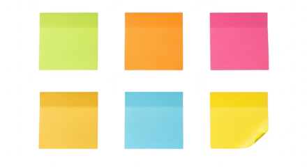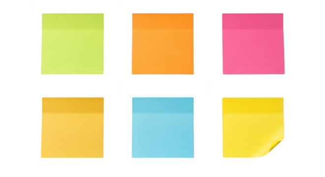 Six colorful square sticky notes in green, orange, pink, yellow, and blue, isolated on a transparent background