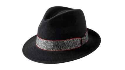 Classic black fedora hat with gray patterned band and red accent, elegant wide brim fashion accessory for men and women isolated on the transparent background