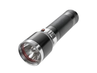 Sleek metallic handheld illumination device with textured grip and red accent flashlight light, Isolated On Png Transparent Background