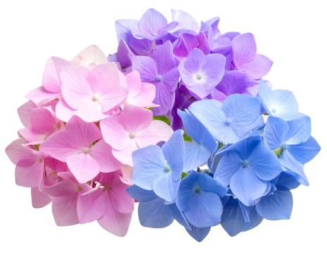 Brightly colored open scissors with blue and pink plastic handles and metallic blades isolated on transparent background
