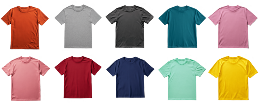 Collection of brightly colored plain T-shirts isolated on a transparent background, perfect for casual fashion and design mockups