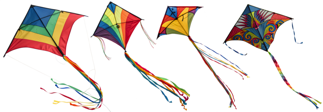 A set with beautiful brightly colored kites on a transparent background. Entertainment and party concept. National Kite Flying Day