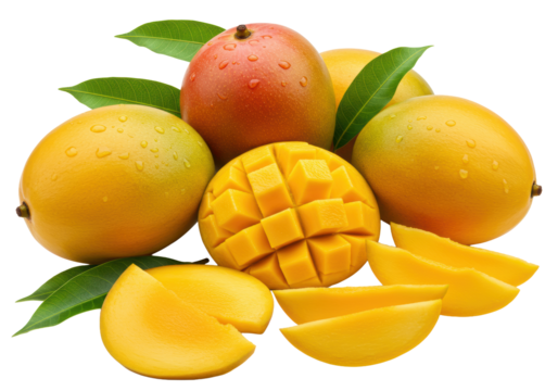 Meticulously arranged collection of fresh, ripe tropical mangoes, whole, halved, and sliced, with water droplets, against a transparent background, brightly lit, Concept of natural tropical sweetness