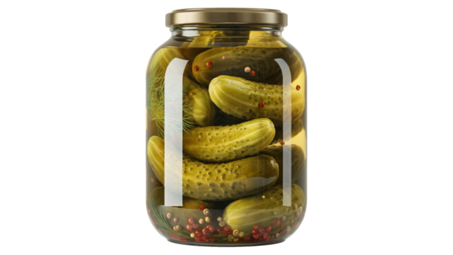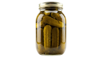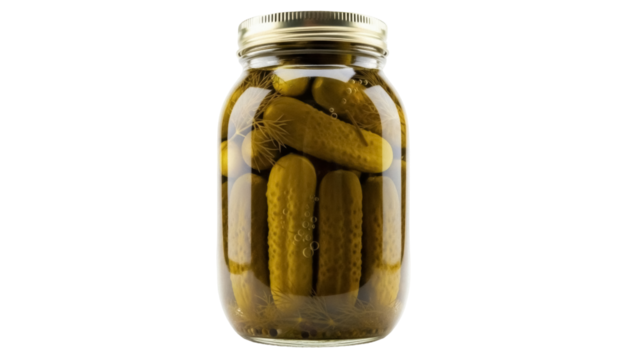 Flat vector illustration of whole pickles preserved in brine inside a glass jar with a green lid and a descriptive label.