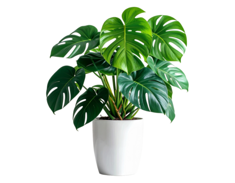 A lush Monstera deliciosa, or Swiss cheese plant, in a clean white ceramic pot,  highlight its vibrant, fenestrated leaves and bring a fresh, botanical style to any interior design