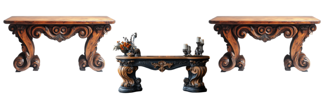 Explore the enduring elegance of exquisite antique Baroque-style wooden console tables, adorned with intricate and ornate carvings. These timeless, vintage furniture pieces bring a touch of sophistica
