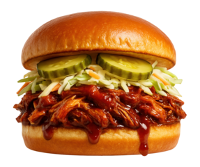 Delicious pulled pork sandwich with bbq sauce and coleslaw on a brioche bun food photography on transparent background