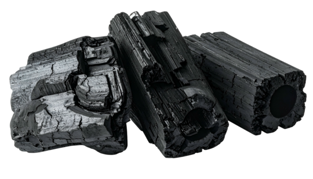 Two dark charcoal briquettes rest on a transparent background. This isolated png image displays the solid fuel carbon forms, ready for use. Transparent.