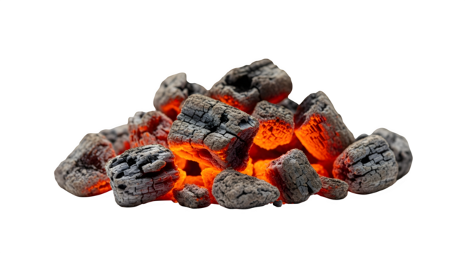 Black Charcoal Briquettes Glowing Embers, Hot Fire for BBQ and Grill Displays, isolated on transparent background.