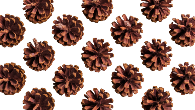 A collection of small pine cones for Christmas tree decoration isolated on white background.
