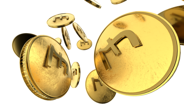 Golden pound sterling symbol representing currency, wealth, economy, and financial success on transparent background