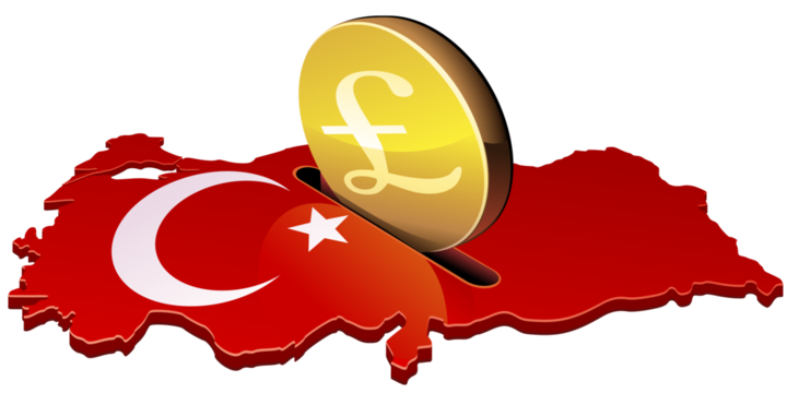 3D map of Turkey in the colors of the Turkish flag with the crescent and the star with a slotin which a gold coin with the symbol of the pound sterling is deposited (cut out)