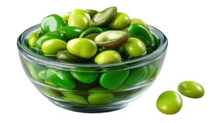 A wooden bowl filled with fresh green fava beans isolated on transparent background