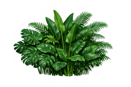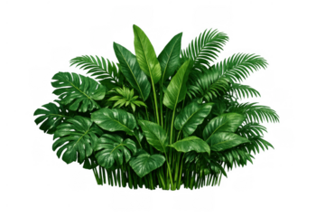 Tropical plant arrangement displaying lush green monstera, palm, and broad leaves, creating a vibrant jungle aesthetic with a transparent background