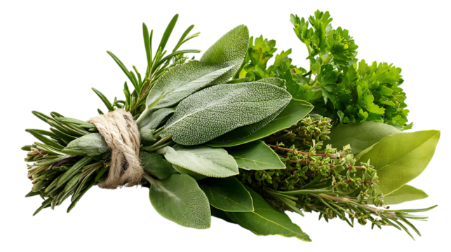 A bundle of mixed fresh herbs tied together with a light-colored string, featuring rosemary sprigs with needle-like leaves and broad sage leaves with a velvety texture.
