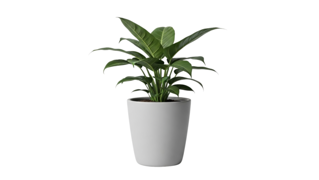 Lush green tropical houseplant with broad leaves thriving in a simple modern white ceramic pot for design use on transparent background