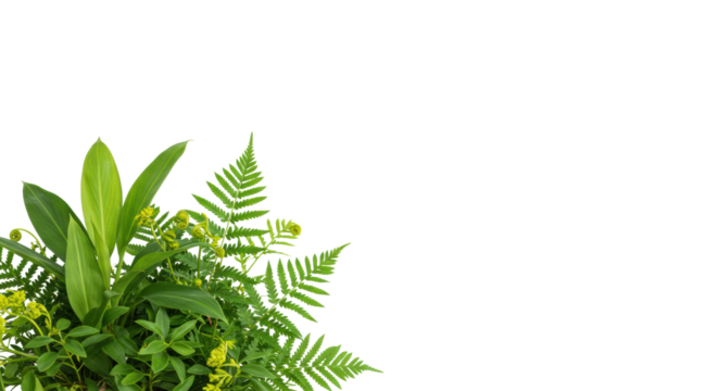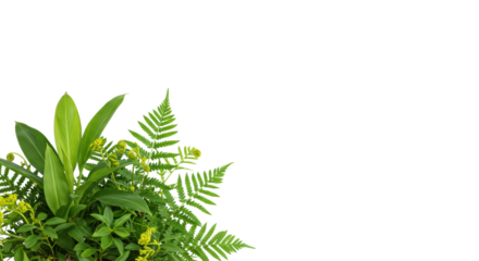 Lush green broadleaf plants and delicate ferns with yellow new growth, styled bottom-left on transparent, copy space, high-key studio photo, concept of natural vitality