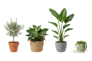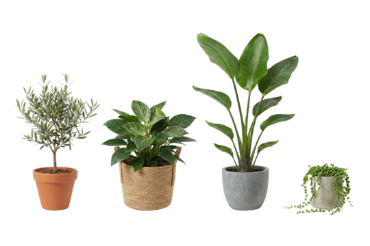 A diverse collection of healthy potted green plants showcased on a clean white background