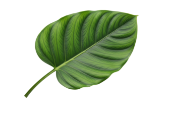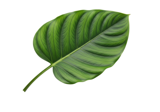 A meticulously rendered vibrant emerald green broadleaf with dark forest veins and a slender stem, against a pristine transparent studio background with copy space, clean product photography concept