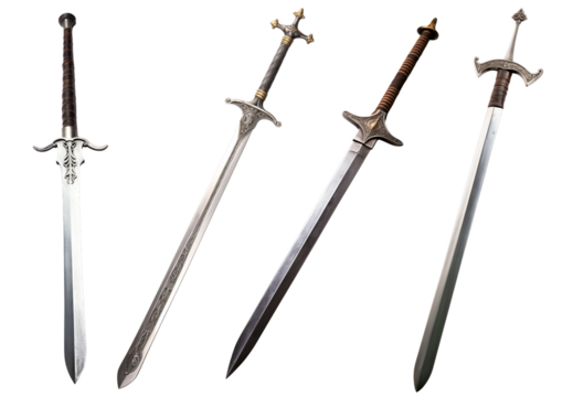 Two realistic medieval broadswords with a steel blade, ornate crossguard, and leather-wrapped grip, isolated on a transparent background
