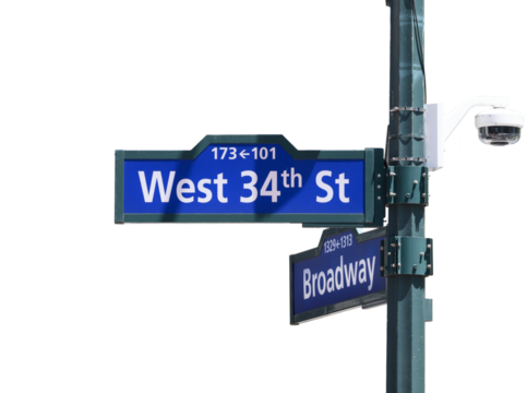 Broadway road sign isolated on white, transparent. Green color street sign on a post in Manhattan New York city, US