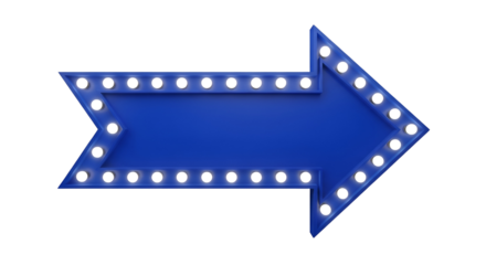 Bright Blue Marquee Arrow Sign with Glowing Bulbs, Pointing Right. Retro Illuminated Directional Indicator for Events, Promotions, and Digital Design on Isolated White Background.