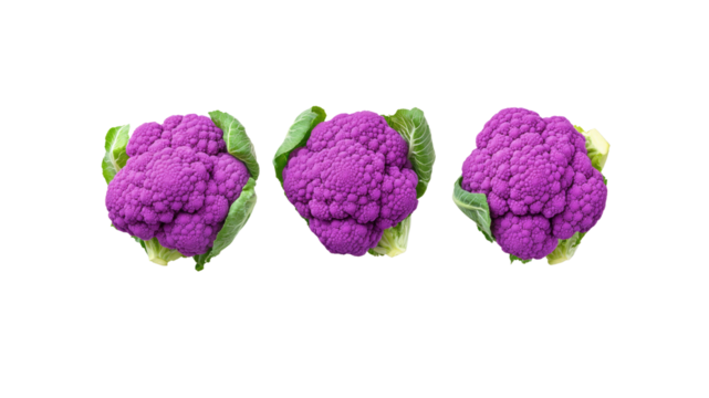 Three Vibrant Purple Romanesco Caulifower Heads Isolated on Black