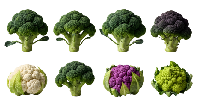 Broccoli, cauliflower and romanesco isolated on transparent background