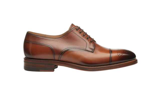 A single polished tan leather Derby shoe with brogue detailing on the toe cap, showcasing elegant craftsmanship. background removed