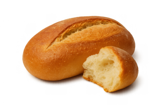 Freshly baked bread roll next to a broken piece, showing soft white interior texture, isolated on transparent background
