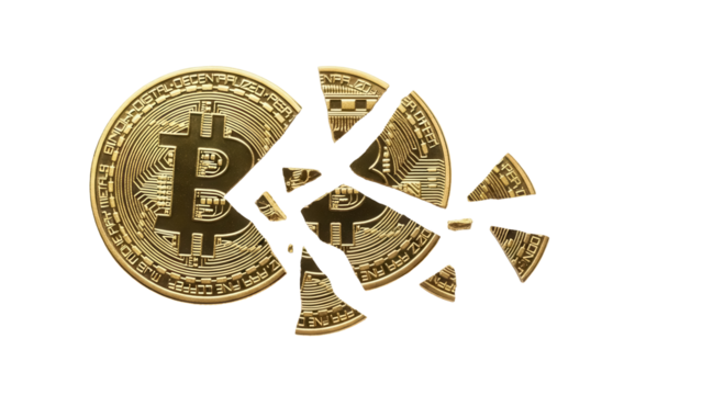 Broken golden Bitcoin coin isolated PNG, cryptocurrency crash concept for financial risk and investment failure on transparent background