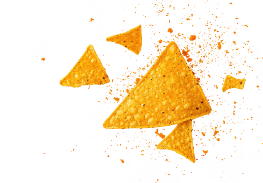 A close-up view of broken tortilla chips scattered on a white background. their crispy texture and color. ideal for food-related content or snack recipes