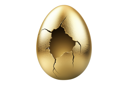 Cracked golden egg with hollow center isolated on white transparent background. The broken shell symbolizes wealth, fragility, and opportunity