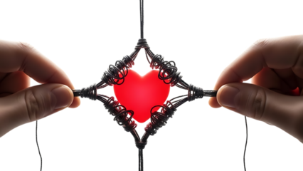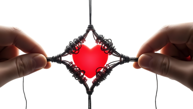 Transparent couple holding red broken heart symbolizing relationship challenges