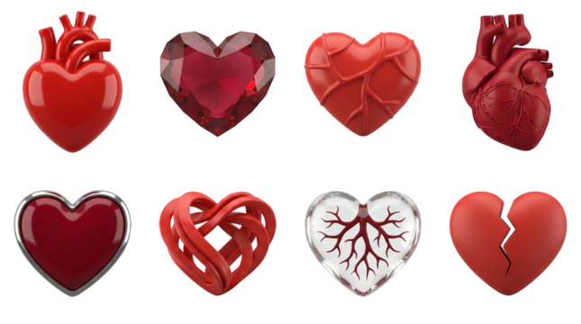 Human heart set including anatomical, stylized, geometric, crystalline, and broken isolated. Medical and romantic design elements.