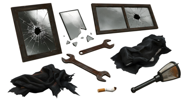 A collection of broken frames with shattered glass, scattered tools, and dark fabric, suggesting a scene of chaos or repair