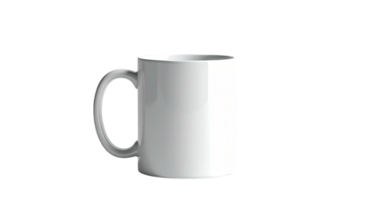 A pristine, white ceramic coffee mug, with a rounded handle, on a black background