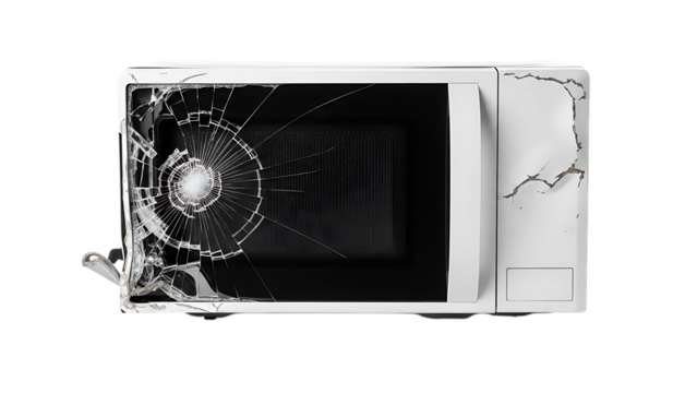 Damaged white microwave with cracked screen and broken glass isolated on a transparent background shattered glass