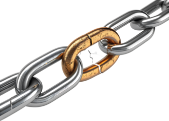 Broken metal chain link symbolizing weakness, disconnection, vulnerability, and system failure