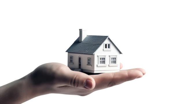 Smiling woman agent holding miniature house model gesturing call me sign isolated on transparent background