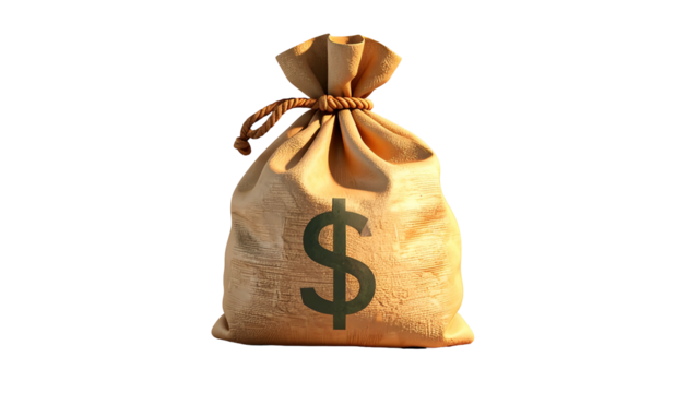 A beige burlap sack tied with rope, featuring a dollar sign on it