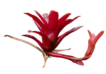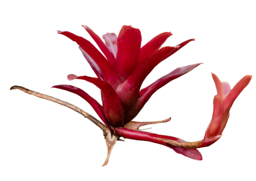 Close-up of the bright red foliage of Neoregelia Fireball, an ornamental plant in the Bromiliaceae family. isolated on white background