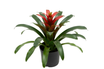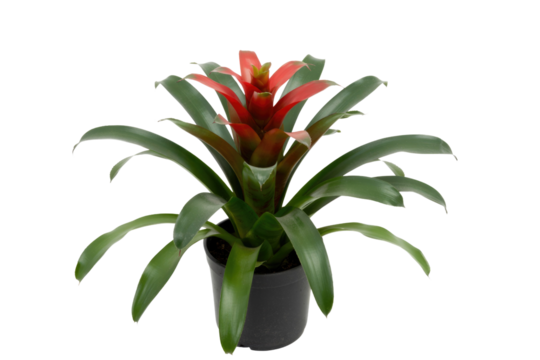 A vibrant red bromeliad plant in a black pot, isolated on a transparent background. background removed