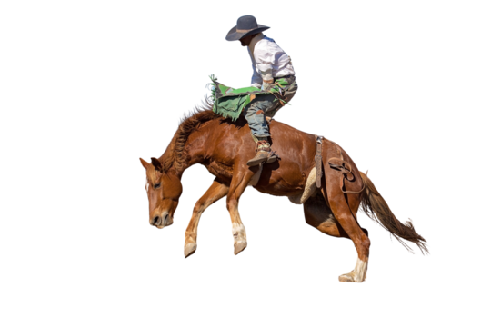 Cowboy riding a bucking bronc At Country Rodeo background removed
