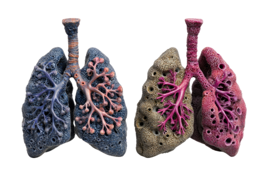 Comparative visual of two sets of severely diseased human lungs, one dark and the other lighter/porous, showcasing respiratory system damage. background removed