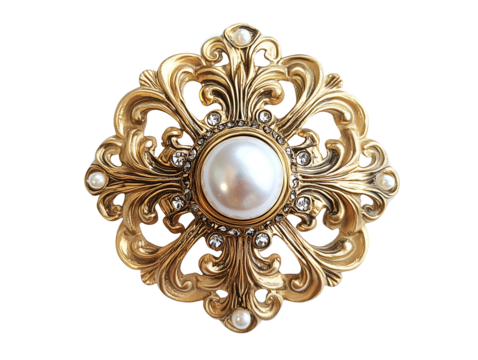Gold brooch with pearls and intricate design isolated on transparent or white background, png
