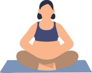 A pregnant woman sits cross-legged on a blue yoga mat, resting her hands on her belly in a peaceful meditative pose