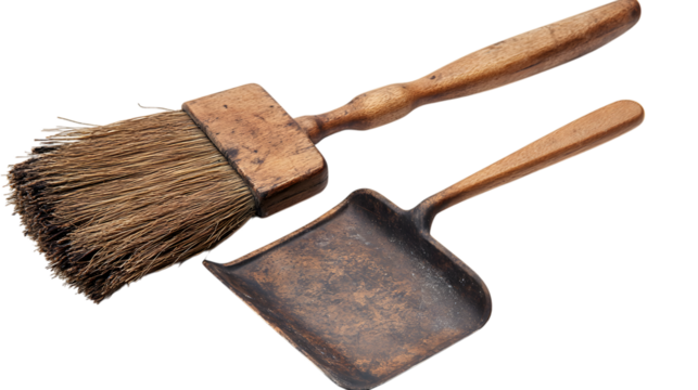A durable broom and dustpan set with matching handles, arranged neatly on a transparent background for a clean and organized appearance