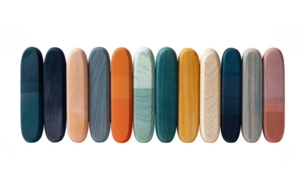 A row of colorful wooden blocks with various shapes and colors is isolated on transparent background
