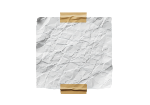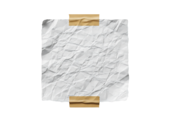 Crumpled white paper note with brown tape. Wrinkled texture mockup. Isolated on transparent background, png